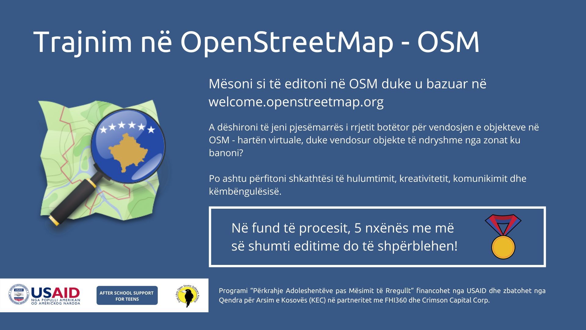 Programi “Përkrahje adoleshentëve pas mësimit të rregullt” i USAID, zbatuar nga Qendra për Arsim e Kosovës (KEC), në bashkëpunim FLOSSK ju fton të angazhoheni për të hartuar sa më shumë objekte në platformën OSM.