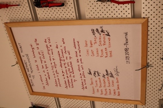 In 2017, with the help of USAID’s After School Support for Teens (ASSET) Program, students at Xhevdet Doda High School in Pristina, worked with their teachers and parents to convert an unused space in their school into a state of the art “Makerspace”. The Makerspace is a collaborative workspace, where students can participate in practical creative projects aimed at developing entrepreneurial attitudes and employability competences. The ASSET Program is providing a variety of technology and materials, to enable students to participate in practical creative projects, relating to science, technology, engineering, mathematics, art and music. They create solutions, design and make products, explore their own creative interests, and develop key competences and self-confidence. In order to maintain the technology in the Makerspace, ASSET experts worked with students in the school to form and train a Student Technician Club. Student Technician Clubs were first introduced into Kosovo schools by USAID’s Basic Education Program 2010 – 2016. Student Technician Clubs provide workforce related training and experience to students while enabling schools to make better use of modern technology. Following their training, in September 2018, the students produced an action plan for the coming year. Already they have accomplished much. They designed the logo on the left and drew up contracts, rules and regulations for the Club. They decided to take an oath which they all signed. This hangs on the wall as a symbol of their commitment.